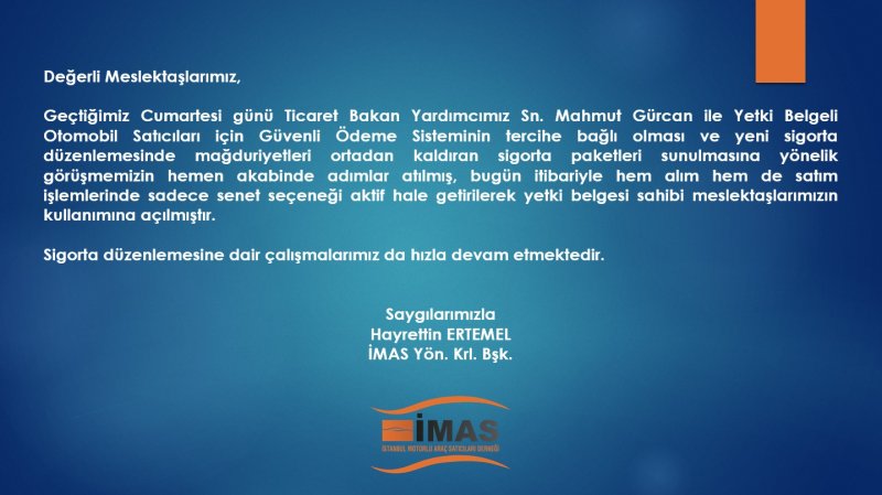 Geçtiğimiz Cumartesi günü Ticaret Bakan Yardımcımız Sn. Mahmut Gürcan ile Yetki Belgeli Otomobil Satıcıları için Güvenli Ödeme Sisteminin tercihe bağlı olması ve yeni sigorta düzenlemesinde mağduriyetleri ortadan kaldıran sigorta paketleri sunulmasına yönelik görüşmemizin hemen akabinde adımlar atılmış, bugün itibariyle hem alım hem de satım işlemlerinde sadece senet seçeneği aktif hale getirilerek yetki belgesi sahibi meslektaşlarımızın kullanımına açılmıştır.