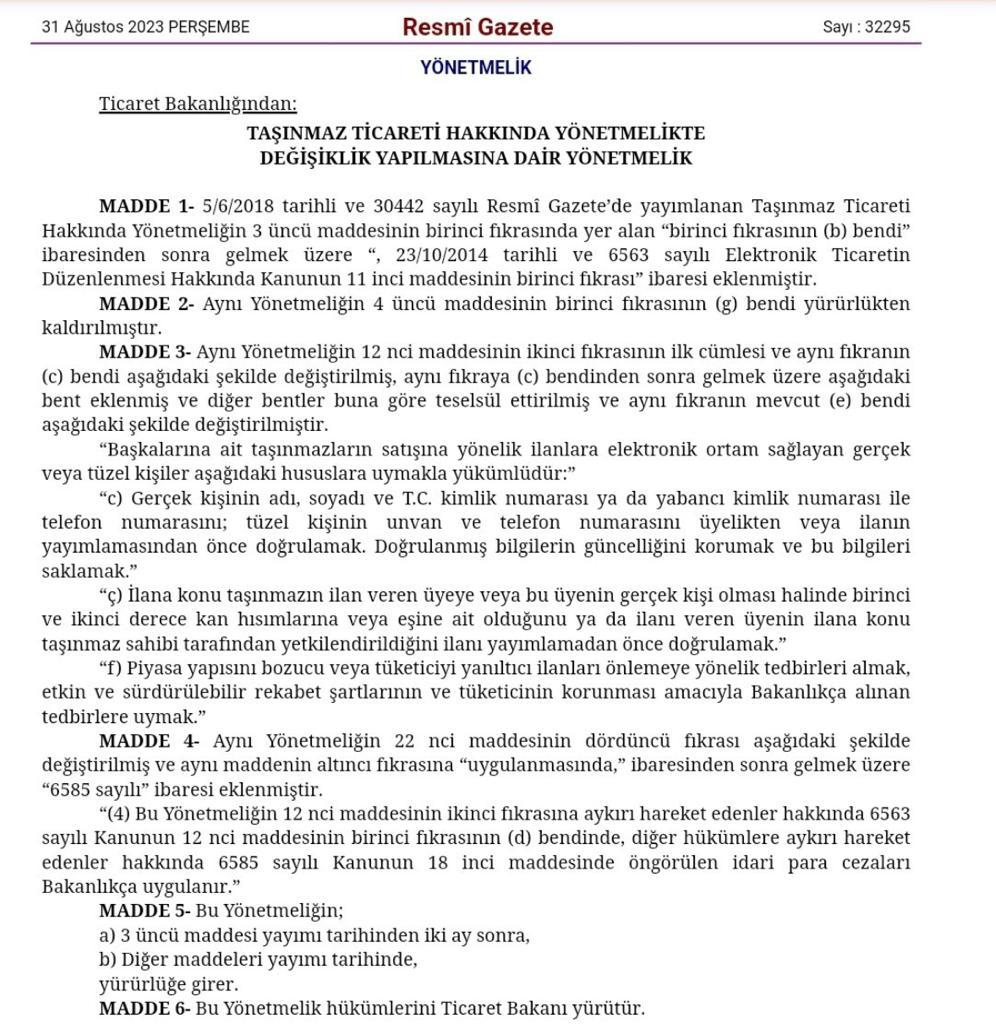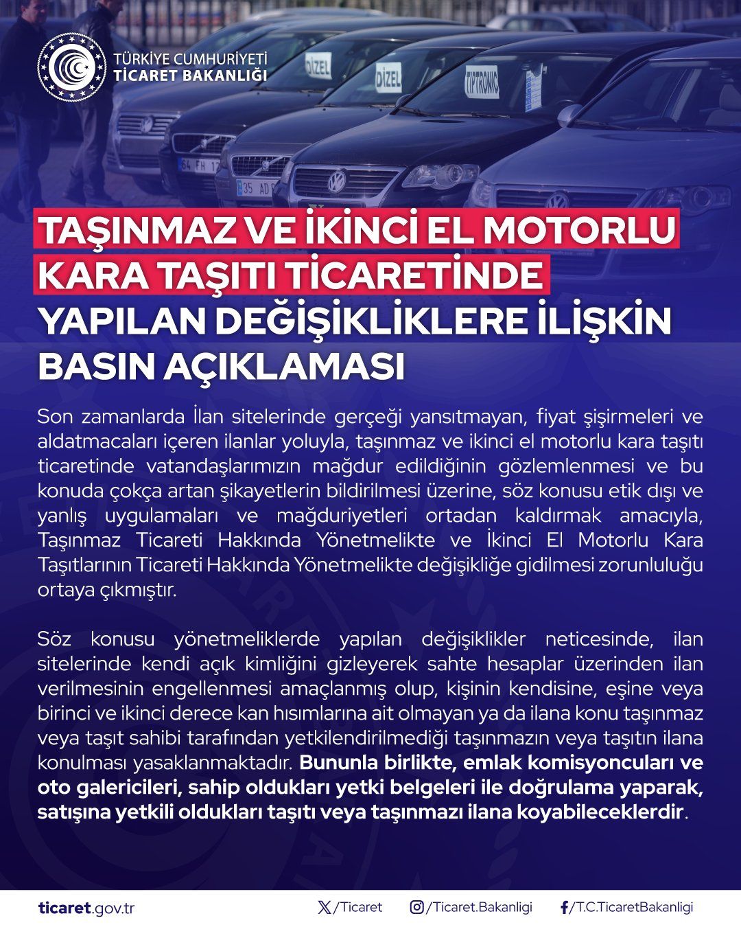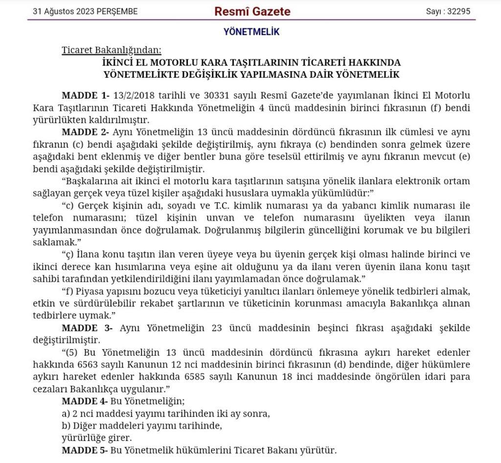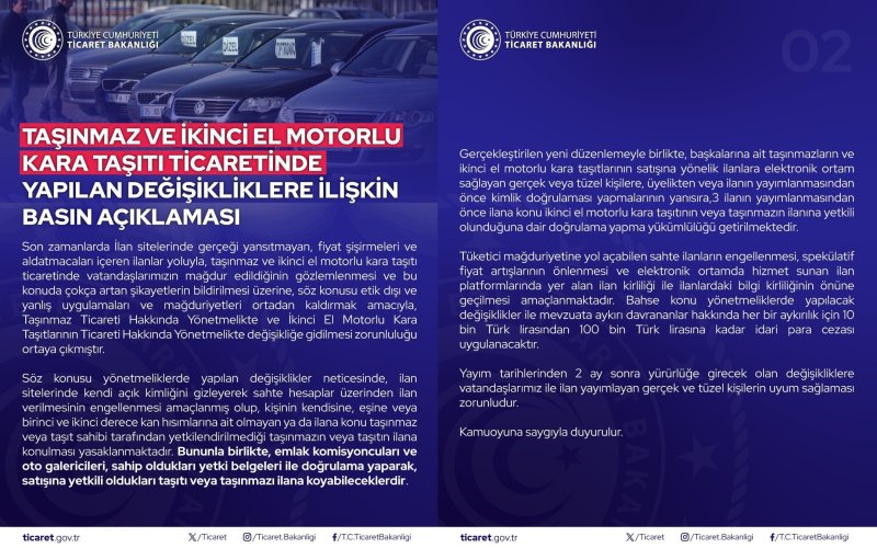 1 Kasım 2023 tarihinden itibaren Kişinin kendisine, eşine veya birinci ve ikinci dereceden akrabalarına ait olmayan araçların ilan sitelerinde paylaşılmasına engel getirilmiştir. Bu şekilde İlan paylaşabilmek için araç sahibinin resmî yollarla ilanı verecek kişiyi yetkilendirmesi gerekmektedir.