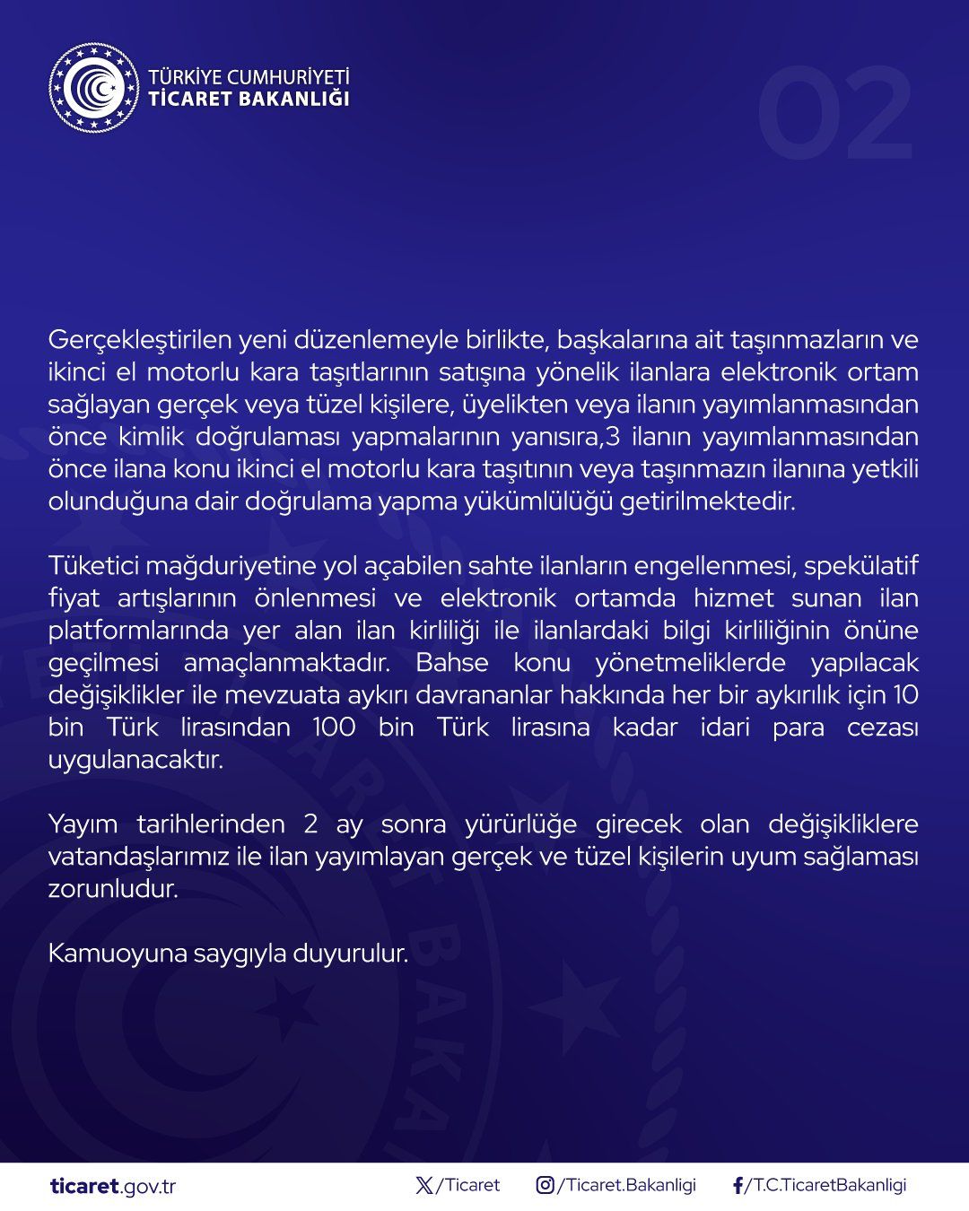 Motorlu Araç Satıcıları Federasyonumuz (MASFED) ve İstanbul Motorlu Araç Satıcıları Derneği (İMAS) olarak Ticaret Bakanlığımıza hem yazılı hem de sözlü şekilde aktardığımız ve çözümü noktasında çalışmalar yürüttüğümüz, internet ortamında denetimsiz ve kuralsız ilan paylaşımı hakkında Bakanlığımız önemli bir adım atarak bazı değişikliklere gitmiştir.